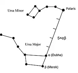 In classical antiquity, Beta Ursae Minoris (Kochab) was closer to the celestial north pole than Alpha Ursae Minoris. While there was no naked-eye star close to the pole, the midpoint between Alpha and Beta Ursae Minoris was reasonably close to the pole, and it appears that the entire constellation of Ursa Minor, in antiquity known as Cynosura (Greek Κυνόσουρα "dog's tail"),[1] was used as indicating the northern direction for the purposes of navigation by the Phoenicians.[2] The ancient name of Ursa Minor, anglicized as cynosure, has since itself become a term for "guiding principle" after the constellation's use in navigation.