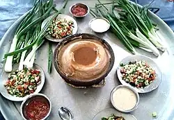 Polenta (/pəˈlɛntə, pˈ-/, Italian: [poˈlɛnta])[2][3] is an Italian dish of boiled cornmeal that was historically made from other grains. It may be allowed to cool and solidify into a loaf that can be baked, fried or grilled.[4] While it is commonly used in savory dishes, it can also be found in sweet preparations such as cakes, cookies, and puddings.[5][6]