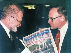 Les Kuczynski, Executive Director of the Polish American Congress presents a copy of Dziennik Zwiazkowy to Bronislaw Geremek, Minister of Foreign Affairs of Poland, 1999