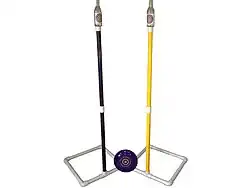Polish horseshoes (also called Spanish horseshoes, frisbeener in the midwest,[1] French darts in Virginia,[2] frisnok in Manitoba,[3] and beersbee elsewhere in Canada[4]) is an outdoor game played between two teams of two people using a frisbee, two glass bottles or cans, and stakes, ski poles or hiking sticks hammered into the ground. The game is played by the players taking turns throwing a frisbee at a glass bottle that rests on top of the stakes in the ground. The two stakes are placed anywhere between 20 and 40 ft (6.1 and 12.2 m) apart. Players must hold a drink in one hand at all times, leaving only one hand free for throwing and catching.