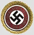 The first 100,000 members who had joined and had uninterrupted service in the Nazi Party were given the right to wear the Golden Party Badge (Goldenes Parteiabzeichen), shown above. Those badges had the recipient's membership number on the back (Adolf Hitler had badge #7). Other Golden Party Badges (with the initials A.H. on the back) were awarded at the discretion of Hitler to certain members of the party who merited special attention. An identical badge was awarded each year on 30 January to persons who had shown outstanding service to the Party or State.[4]