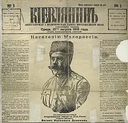 In national politics, Denikin adhered to the concept of "one and indivisible Russia", which did not allow to discuss any autonomy or self-determination of the territories that were part of the former Russian Empire within the pre-war borders. One of the main national issues on Denikin's agenda, as leader of the forces that occupied most of Ukraine's territory in 1919, was the Ukrainian question. On 12 August 1919, in Taganrog, with the participation of the publicist Vasily Shulgin, the history teacher Pavel Novgorodtsev and other public figures, an "Appeal to the population of Little Russia" was prepared, which was later published in all parts in the White Guard press from the cities of southern Russia, controlled by the VSYuR. The appeal formulated the principles of the national policy of whites in relation to the territory and population of Ukraine in 1919.[5][6]
