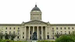 The judicial arm consists of the Chief Justice and the judges who preside over the courts. These three branches are linked through the Crown, which is the head of state and represented by the Lieutenant Governor of Manitoba.[2] Under section 23 of the 1870 Manitoba Act (which is part of the Constitution of Canada), both English and French are official languages of the legislature and courts of Manitoba.