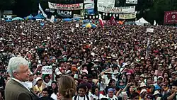 On December 1, 2018, Andrés Manuel López Obrador was sworn in as Mexico's first leftist President in seven decades after winning a landslide victory in the 2018 election.[36] In the 2021 midterm election, López Obrador's left-leaning Morena coalition lost seats in the lower house of Congress. However, his ruling coalition maintained a simple majority, but López Obrador failed to secure the two-thirds congressional supermajority. The main opposition was a coalition of Mexico's three traditional parties: the center-right Revolutionary Institutional Party, the right-wing National Action Party, and the leftist Party of the Democratic Revolution.[37]