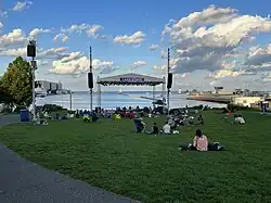 The Polk Bros Performance Lawns are a pair of lawns at the park's south end, with stages City Stage and Lake Stage. City Stage has steps to seat approximately 700–750 people, and faces west, and Lake Stage has an east-facing, sloping lawn which can accommodate approximately 1,700 people.[1][2] The lawns are separated by a landscaped hilltop.[2]