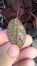 Growing to 30 cm (12 in) tall and broad, it is an evergreen shrub with leaves heavily-spotted pink or white, as if sprayed with paint. This small shrub with green foliage stained with pink-purple dots forms bushy and compact tufts. The leaves are opposite, oval and pointed. They are borne by petioles of 2 to 4 cm 1. The most common type has green leaves with pink spots, although it can range from white to any shade of pink to red. The spots on the undersides of the leaves are far lighter in color, often white.