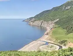 The cove is surrounded by the Cape Breton Highlands. The surrounding land is owned by the province, and has protected wilderness status.