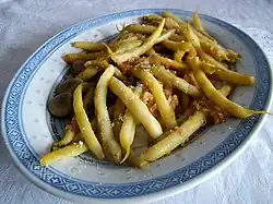 Polonaise sauce (French: sauce à la polonaise, pronounced [sos a la pɔlɔnɛz]) is a sauce that originated in Poland and became popular in France in the 18th century.[1] The sauce consists of melted butter, chopped boiled eggs, breadcrumbs, salt, lemon juice and herbs such as thyme, basil and parsley. It is poured over cooked or steamed vegetables, typically cauliflower, asparagus, wax beans or broccoli.[2][3][4][5] Velouté à la polonaise is a wholly different sauce.