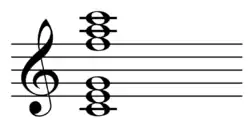In music and music theory, a polychord consists of two or more chords, one on top of the other.[2][3][4] In shorthand they are written with the top chord above a line and the bottom chord below,[5] for example F upon C: F/C.