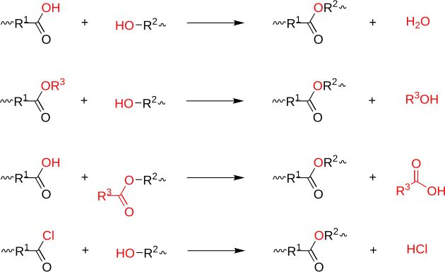 Polyesterifications are grouped by some authors[4][19] into two main categories: a) equilibrium polyesterifications (mainly alcohol-acid reaction, alcohol–ester and acid–ester interchange reactions, carried out in bulk at high temperatures), and b) non-equilibrium polyesterifications, using highly reactive monomers (for example acid chlorides or activated carboxylic acids, mostly carried out at lower temperatures in solution).