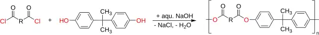 The reaction between diacyl chlorides and alcohols or phenolic compounds has been widely applied to polyester synthesis and has been subject of numerous reviews and book chapters.[4][19][20][21] The reaction is carried out at lower temperatures than the equilibrium methods; possible types are the high-temperature solution condensation, amine catalysed and interfacial reactions. In addition, the use of activating agents is counted as non-equilibrium method. The equilibrium constants for the acyl chloride-based condensation yielding yielding arylates and polyarylates are very high indeed and are reported to be 4.3 × 103 and 4.7 × 103, respectively. This reaction is thus often referred to as a 'non-equilibrium' polyesterification. Even though the acyl chloride based synthesis is also subject of reports in the patent literature, it is unlikely that the reaction is utilized on the production scale.[22] The method is limited by the acid dichlorides' high cost, its sensitivity to hydrolysis and the occurrence of side reactions.[23]