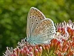 L. meleager Esp. (= daphnis Bgstr., female = endymion Schiff.) (81 a). male very large and very light sky-blue, strongly glossy, with a very narrow black margin. Underside pale grey-brown, with the base dusted with blue, the ocelli but little prominent and those near the margin of the hindwing very weak. Female at once recognized by the dentate anal portion of the outer margin. From Central and South Germany, Switzerland and South France throughout South-East Europe and Asia Minor to Syria and Kurdistan. – ab. limbopunctata Schulz are males with black marginal spots on the upperside. ab. steeveni Trk. (81 a) are strongly darkened females, which have a very wide distribution among ordinary specimens, but are more frequently found in the East, in Greece, Asia Minor, etc. – versicolor Ruhl-Heyne is a form from Mesopotamia with the upperside very light blue and the marginal spots of the underside entirely obsolete. – ignorata Stgr. [= P. d. versicolor (Rühl, 1895)](81 a), from Akbes in the south-western Taurus, is very peculiar as regards colour; the upperside of the female is traversed by many shadowy streaks situated on the veins; the hindwing of the male is likewise dentate in the anal portion, while in the female the teeth are so strong that they form 2–3 short tails. – Larva green with yellow swellings; spiracles black. Until June on Thymus, Orobus, Astragalus, and Coronilla. The butterflies in July and August; they are partial to limestone soil and occur singly in hot valleys, more in the hills and plains than in the mountains; on meadow-flowers, singly.[6]