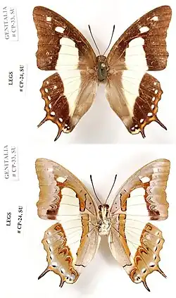 The species closely resembles Polyura jalysus, but differs from jalysus as follows: Upperside: forewing with bluish-white scaling on the outer margin of the discal greenish-white area, the outer broad black area on terminal margin not narrowing posteriorly, margin of nearly equal width at tornus and anteriorly. Hindwing: the blue scaling at base and along middle of outer margin of discal greenish-white area much broader; black along terminal margin irregular, much broader above than in jalysus, narrowing in the middle, where it is subinterrupted by the blue scaling, and widening again between veins 2 and 4; the row of white spots traversing it transverse and larger; the transverse ochraceous series of lunules paler, almost white, and barely indicated between veins 2 and 4. Underside: the discal greenish-white area on both forewing and hindwing narrower than on the upperside, the chocolate-coloured band on forewing curving round parallel to the costa not so well defined on the outer margin as in jalysus, the costal margin beyond it, the base of the wings and the dorsal margin broadly lilacine reddish brown as in Polyura arja, not grey as jalysus, as is also the space between the postdiscal series of lunules and the terminal series of ochraceous markings.[1]