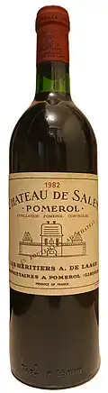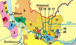 Pomerol (French pronunciation: [pɔmʁɔl]) is a French wine-growing commune and Appellation d'origine contrôlée (AOC) within the Libournais ("Right Bank") in Bordeaux. The wine produced here is predominately from Merlot with Cabernet Franc playing a supporting role.[1] Unlike most other Bordeaux communes, there is no real village of Pomerol, although there is a church. The houses are set among the vineyards.[2][3]