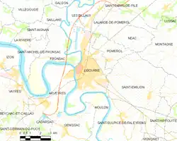 Pomerol lies immediately to the east and north-east of Libourne. Unlike most of the most prestigious communes of Bordeaux, it has no direct river access, being separated from the Dordogne to the south by the town and by Saint-Émilion, which lies to the south-east. To the north-east, across a stream called la Barbanne Rau lies Lalande-de-Pomerol. It stands on a gravel bank (a feature it shares with the prestigious appellations of the Médoc); towards the south and west, the soil is more sandy, while towards the north and east, it tends to clay. The sub-soil is dark packed clay, with a high iron content.[4][5] The terrain is relatively flat with slight undulating slopes that fall from a height of 35–40 metres (115–131 ft) above sea level over a course of 2 kilometres (1.2 mi) to around 10 metres (33 ft).[11]