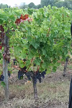 The Pomerol region, and its northern border, the Barbanne river was historically considered the frontier boundary between the north where people spoke the Langues d'oïl and the south where they spoke the Langue d'oc.[7] Though it is difficult to pinpoint exactly when grapes were first planted in the Pomerol region there is enough evidence to show that viticulture was present in the area during the time of the Romans.[9] Similarly there is uncertainty as to the origins of the name "Pomerol", although there is some speculation that it stems from the Latin word poma which refers to a fruit bearing seeds and is the origin of the French word pomme, meaning apple. This theory is supported by the region's long history of polyculture with many other crops, particularly fruits and grains, being cultivated in the area long before viticulture became a primary focus.[3]