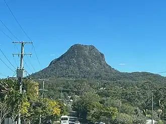 Mount Cooroora is in the south-west of the locality (26°22′17″S 152°50′17″E / 26.3713°S 152.8380°E), rising to 439 metres (1,440 ft).[6] It is a high intrusive volcanic plug within the Tuchekoi National Park.[7] It is approximately 2 kilometres (1.2 mi) south-west of the town.[4] The surrounding area is of high importance to Aboriginal people and there are many sites of Indigenous cultural importance across the region. Mount Cooroora has significant landscape, social and economic values to the town, while its vertical columns are an attraction to geologists. It is a popular site in the cooler months for visiting tourists climbing to the summit to appreciate excellent views looking east to the Sunshine Coast and west into the Mary Valley. Hikers, horse riders and mountain bike riders use the excellent trail network at its base.[8]
