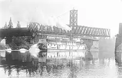 Pomona was reconstructed in 1926.[3] The reconstructed boat was much smaller, rated at 216 gross tons and 120 net tons.[3] The new boat was designed to pass under the draw of the Kelso bridge on the Cowlitz river.[43] While the Kelso bridge was a lifting span, the rebuilt Pomona was intended to be able to pass under the bridge without having to raise it.[44] The length was reduced from 134 feet to 120 feet.[29]