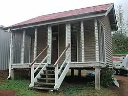 The 1934 police residence is also clad in weatherboard and highset on concrete perimeter posts, with the same window hoods and casement windows as the court house. Its L-shaped veranda has been enclosed. A front gable contains the office, reached by side stairs leading to projecting gabled portico. A rear gable contains the kitchen. The original design contained three bedrooms and a living room, and an enclosed veranda with sliding sashes between the kitchen and bathroom at the rear of the house, but we were unable to inspect the current interior. Front and rear stairs rise parallel to the house, leading to the front veranda and rear door, respectively. Externally, apart from the enclosed verandas, the removal of the 1000-gallon water tanks, and the angle of the stairs to the office, it closely resembles the original 1932 architect's plans.[1]