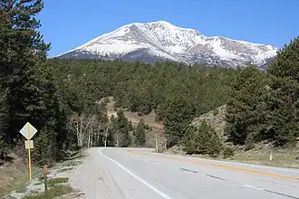 Poncha Pass (9,010 ft; 2,750 m) is a mountain pass in South-Central Colorado (USA). It lies between the San Luis Valley to the south and the valley of the Arkansas River to the north.[1] It is in the saddle between the Sangre de Cristo Range, lying to the southeast, and the Sawatch Range, lying to the west and northwest. The small town of Poncha Springs lies about 6 miles (9.7 km) north of the pass. The pass has a mild approach on the southern side and a moderate 5% approach from the north. It remains open all year round and does not normally cause problems for vehicles in winter.