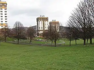 In the first half of the 19th century the lower part of The Ponderosa was open countryside just to the south west of the Sheffield General Infirmary which at that time stood in a rural location to the west of the town. During the second half of the 1800s an area of back-to-back houses known as the Port Mahon estate was constructed on the site. This housing stood until the 1960s when it was demolished as part of a programme of urban development in the Upperthorpe and Netherthorpe areas. Certain thoroughfares such as Wentworth Street, Watery Lane, Hammond Street disappeared and Burlington Street partially disappeared altogether and the housing between Martin Street and Wentworth Street was replaced by tower blocks and maisonettes leaving a central area for recreation. This recreation area was christened "The Ponderosa" by local children after the name of the ranch in the TV series Bonanza which was popular throughout the 1960s.[3]