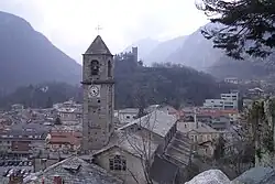 Pont Canavese is a comune (municipality) in the Metropolitan City of Turin in the Italian region Piedmont, located about 40 kilometres (25 mi) north of Turin. It occupies a small fluvial plain between the rivers Orco and Soana: its names (Pont, derived from the Latin ad duos pontes, being the Franco-Provençal word for "bridge") derives from the series of bridges that were historically built here to cross those rivers.