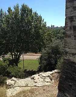 The bridge had great strategic importance as when first built it was the only fixed river crossing between Lyon and the Mediterranean Sea. It was also the only river crossing between the Comtat Venaissin, an enclave controlled by the Pope, and France proper under the authority of the kings of France. As such, it was closely guarded on both sides of the river. The right bank, which was controlled by the French crown, was overlooked by the fortress of the Tour Philippe-le-Bel which was built at the beginning of the 14th century.[29] On the Avignon side, a large gatehouse was erected in the 14th century and then extensively modified in the 15th century. The walkway passed over the city wall and down a ramp (now destroyed) which led into the city.[30]
