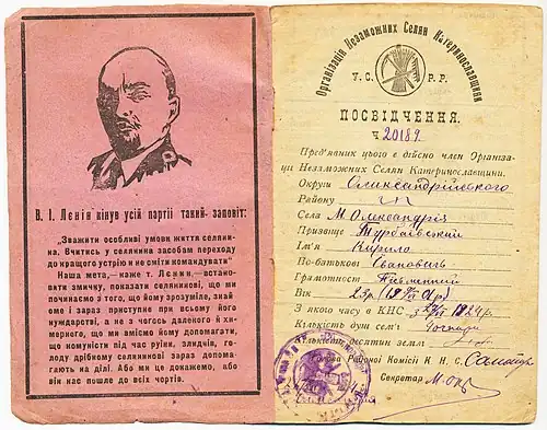 The kombeds were given the task of helping to locate and confiscate surplus grain from other peasants of that same village. The groups were also placed in charge of the distribution of food, manufactured commodities, and those limited agricultural implements that were available to the members of the village.[2] This activity inevitably brought the members of the kombed into conflict with others in the village from whom grain was taken.