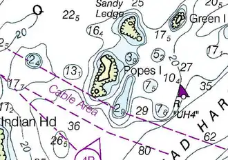 There is a seven-fathom patch between Pope's and Chocolate Cove.[5]
