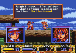The character encounters enemies as well as non-playable characters. Often, when encountering an important character, the dialogue scenes begins immediately, with the player having differing levels of control over it depending on the version. Varying amounts of these scenes are voiced in the Sega CD and Super CD-ROM² versions, and the voiced parts cannot be skipped over as quickly as the non-voiced parts. In the Sega CD version, the voiced speech can be turned off in the options menu if so desired.