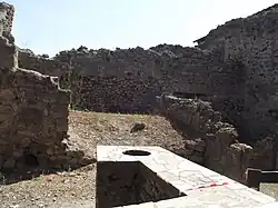 The popina usually fronted streets and was separated by a broad doorway. A service counter in a L or U shape would be in the main room where workers likely served customers food and drink. Frequently, a small water heater would be included into the counter or located nearby. In some popina, there would even be water basins embedded into the counter, such as in Ostia.[2] Martial, a 1st-century Latin poet, describes a popina that had grown so massive it had occupied the entire street.[2][3]