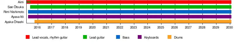 The band consists of Aimi (lead vocals, rhythm guitar), Sae Ōtsuka (lead guitar), Rimi Nishimoto (bass), Ayaka Ōhashi (drums), and Ayasa Itō (keyboard). In the anime and game, the band is represented by Kasumi Toyama (Aimi), Tae Hanazono (Ōtsuka), Rimi Ushigome (Nishimoto), Sāya Yamabuki (Ōhashi), and Arisa Ichigaya (Itō). Poppin'Party serves as the protagonists of the anime, which began airing in 2017.
