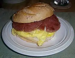 Pork roll is typically eaten as part of a sandwich and frequently paired with egg or cheese.[10][13] A popular breakfast sandwich in the region is the "Taylor ham, egg and cheese"[10] a.k.a. "pork roll, egg and cheese"[22] in which fried pork roll is joined with a fried (or scrambled) egg and American cheese and served on a hard roll, bagel, or English muffin.[19][10][22]