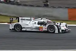 At the season-opening 6 Hours of Silverstone, Dumas and Jani's No. 14 car started from third while Webber and Bernhard's No. 20 car was sixth.[59] In the opening laps of the race, a problem with the front left wheel bearing forced Jani to the garage before retiring with an unrelated hydraulic problem after 30 laps. Bernhard passed Alexander Wurz's No. 7 Toyota TS040 Hybrid for second place at the beginning of the second hour on lap 53, but the No. 20 car slowed after it began raining because of its low-downforce package, ultimately finishing the weather-shortened race in third.[60][61] Two weeks later, Jani and Lieb took the car's first pole position in changeable weather in the qualifying's final seconds at the 6 Hours of Spa-Francorchamps while Bernhard and Hartley began from fifth place.[62] The No. 14 car led the first two hours until Sébastien Buemi's No. 8 Toyota passed it. An electrical fault disabled the No. 14's hybrid system and losing the car two laps, falling to 23rd overall with a subsequent rear damper problem and two front driveshaft faults.[63][64]