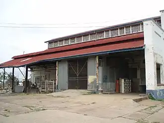 The butter stores are located between the Administration building and the butter factory to the north. The butter stores are in four parts. There is a two-storey wing along the western end which has a despatch/loading area at the excavated platform level of the factory and staff amenities on the upper level which aligns with the ground floor level of the Administration Building. This section has a gabled corrugated fibrous cement roof and metal framed double hung windows - larger openings have fixed sidelights. The stores are divided into three bays and are located at right angles to and are attached to the eastern wall of the dispatch wing. Two of the bays (to the south) have external wall of concrete frame and infill construction with corrugated fibrous cement gable roofs surmounted by pairs of large ventilators. The gable ends are lined with flat fibrous cement sheeting with timber cover battens and house louvred vents below which a suspended fibrous cement awning provides protection to several large doors which open onto a platform. The third bay to the north is of a similar form but of different construction. It has a corrugated iron roof and appears to have corrugated iron clad walls and steel framed windows.[1]
