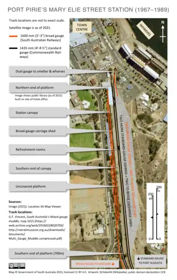 | At various times during a period of close to 140 years, Port Pirie had six railway stations. During the 45-year period 1937–1982, the city became well known as one of the few locations in the world having three railway gauges.[note 1] This situation was a result of South Australia's slow transition from lightly constructed narrow gauge to heavy-rail broad gauge (which predominated in the state at the time), then to standard gauge when lines between the mainland state capitals were at last unified. As a consequence, all Port Pirie stations that succeeded the inaugural station of 1876 were either built to accommodate a change of gauge or were affected by one. The timeline, reasons for change, and gauges involved are shown in the following graphic. Timeline of Port Pirie's six railway stations ![]() |