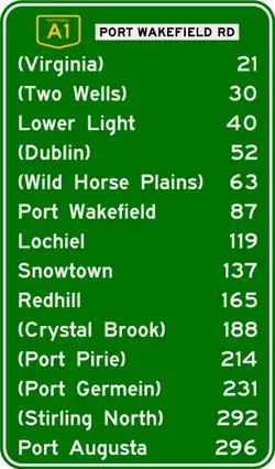 Port Wakefield Highway (and its southern section as Port Wakefield Road) is an important South Australian highway, connecting Adelaide to the Yorke Peninsula, Port Augusta, northern and western South Australia, the Northern Territory and Western Australia. It is designated National Highway A1 and a part of the National Highway. It is named after Port Wakefield, the first government town north of Adelaide.