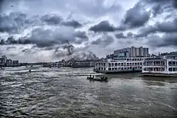 The Sadarghat (lit. 'City Wharf') stands a little left in front of the Ahsan Manzil. Sadarghat is also the central point of the Buckland Bund. Originally, it was built as a place for docking of boats, launches and even ships coming to Dhaka. Large vessels can no longer use it because of shoaling up of the river bed entry and an overall downsizing of the capacity of the inland waterways.[5]