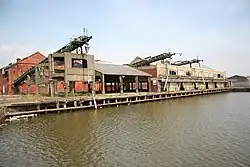 Installations added after the opening of the dock included a graving dock, and facilities for handling rail borne coal shipments.[70] The two coal drops and rail lines were built over the far end of the dock on timber piers.[71] the first was completed by 1856 at a cost of £3,435, the second, at £3,500, soon after.[72] The 350 feet (110 m) graving dock was built east of the dock's lock, with an entrance of 70 feet (21 m). The design was by Adam Smith, and was contracted to James Taylor (Manchester) for £32,000 in 1855, the work was completed by 1858.[72][73] Initially a Cornish engine from Perran Foundry (Cornwall) was installed to fill the dock with water from wells, but its use ended when the well's water supply failed.[74]