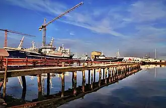 The harbour is currently being adapted to accommodate large international cruise ships. A new 450 m (1,480 ft) berth will be completed by 2015, while the existing 170 m (560 ft) berth will be extended to 200 m (660 ft).[19] On the shipbuilding front, Karstensens Skibsværft continues to prosper with orders for trawlers from Norway.[20] There are also plans for establishing oil-bunkering facilities for large vessels on the outer section of the new port.[21]
