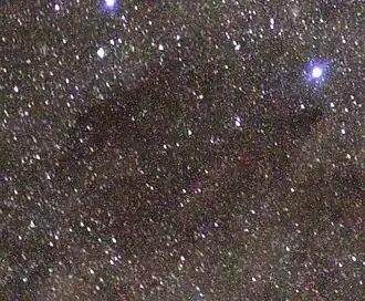 ![]() The Coalsack Nebula is a dark nebula in the constellation of Crux Australis. Dark nebulae consist of cold dense clouds of gas and dust, which are only seen because they obscure visible light from more distant objects. Dark nebulae are often the location of star formation, which can be revealed within them by observations at infrared and radio wavelengths, which are much less affected by absorption and scattering by interstellar material |