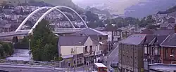 During prehistoric times the area now known as Porth was an uninhabited wooded area. Although there is evidence of settlements in the upper reaches of the valley, only cairns used as way-markers have been discovered on the higher points in the Porth area.[2] During the medieval period the area came under the commote of Glynrhondda within the cantref of Penychen, though the area remained uninhabited.[3] Although there were no permanent buildings of note at this time, it is known that the area would have experienced travelers with two bridges built over the River Rhondda at Porth, the Pont Rheola and Pont y Cymmer. Both bridges date to at least the 1530s when they were mentioned by antiquary John Leland. These bridges were wooden in construct and were later rebuilt in stone.[4] The first buildings of note in the region were built to the south of Porth in the community known today as Cymmer, mainly a chapel, Capel y Cymmer (1743) and a mill on the south bank of the River Rhondda.[5] By the 18th century there were a handful of farm houses, mainly in the northern slopes of Llwyncelyn. During this pre-industrial era, the locale was known as Cymmer, an old Welsh word that describes the point where two rivers converge. It was only during the industrial period that the mining operations of the Porth Estate and the subsequently named railway station that saw the name Porth adopted.[6]