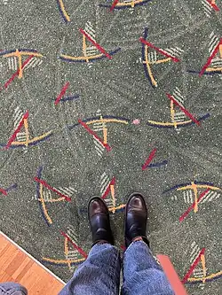To reduce the amount of noise created by people walking across hard terminal floors, the Port of Portland contracted SRG Partnership to design new carpeting for Portland International Airport (PDX) in 1987. The SRG principal and co-designer of the carpet, Jon Schleuning, visited several airports before deciding what to create for the carpet at PDX. SRG steered away from the earth tones traditionally used by airports in the 1980s, incorporating blue and green into their design early on and hoping to evoke "northwest to the core".[7] Its pattern featured geometric shapes on a teal background,[8] an abstract depiction of the intersecting north and south runways seen by air traffic controllers from the airport's tower at night.[7][9][10] Several acres of the carpet were installed by the early 1990s.[7]