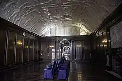 Williams-Ellis created the Hercules Room by acquiring the ceiling from the banqueting hall at Emral Hall, near Maelor in Flintshire just before it was demolished in 1936. He managed to buy the ceiling cheaply for £13 at the pre-demolition auction, subsequently also buying the stone mullioned windows and fireplaces.[4] The Emral estate had been established by the former member of parliament, Sir Roger Puleston, and rebuilt by his descendants in the early 18th century. The ceiling was barrel vaulted and depicted the labours of Hercules and the signs of the zodiac in white plaster cast.[5] According the architectural historian, Nigel R. Jones, Williams-Ellis's work at Portmeirion, and his work on the town hall in particular, earned him a reputation in the architectural world for creating "a home for fallen buildings".[6] A statue of Hercules, which had been sculpted by William Brodie in 1863, was relocated from Aberdeen to Portmeirion and erected near the town hall in 1960.[7][8]