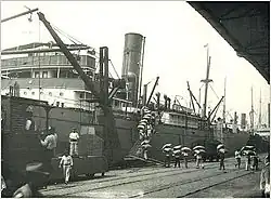 The port of Santos was originally founded on Tuesday, 2 February 1892.[5] In 1913, there were about 90,000 inhabitants in the city of Santos and the economically active population was at about 37,000 with 22.7 percent working in the port as longshoremen, stevedores, carters, porters and coffee sackers.[6] During the time after World War II, up to 1960, the port was known as the “Red Port” because of strong influence of communism in the workers unions and city's politics.[5] Lack of investments and high tariffs were factors observed at the time and led the Port of Santos to a rapid decay around 1970.[5] In 1980, the 90-year concession period ceded to Companhia Docas de Santos or CODESP.[5] CODESP was a big player in the ports structure and worker culture. CODESP was in control of most of the port operations, created a new culture of work that created stronger bonds between the workers, and allowed for the creation of institutions to unite different categories of workers.[6] Ever since the late 19th century the CODESP has tried to gain even more control over port operations.[6] This, however, violated the workers’ sense of freedom and independence and caused the uprising of many of the worker institutions through different strikes for worker rights. In 1993, the Brazilian government realized that the singular control over the port that CODESP had was inhibiting the ports ability to be competitive and be more efficient.[6] They then passed a law that de-monopolized the port's operational services.[6]