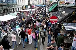 Portobello Road is a street in the Notting Hill district of the Royal Borough of Kensington and Chelsea in West London. It runs almost the length of Notting Hill from South to North, roughly parallel with Ladbroke Grove. On Saturdays it is home to Portobello Road Market, one of London's notable street markets, known for its second-hand clothes, pastries and antiques.[1] Every August since 1996, the Portobello Film Festival has been held in locations around Portobello Road and, in 2015, Portobello Radio was founded as the area's community radio station.[2]