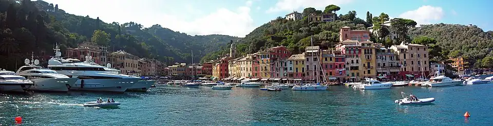 Portofino (Italian pronunciation:[ˌpɔrtoˈfiːno]; Ligurian: Portofin[ˌpɔɾtuˈfiŋ]) is a comune located in the Metropolitan City of Genoa on the Italian Riviera. The town is clustered around its small harbour, and is known for the colourfully painted buildings that line the shore.[3] Since the late 19th century, Portofino has attracted tourism of the European aristocracy and it is now a resort for the world's jet set.[4][5]