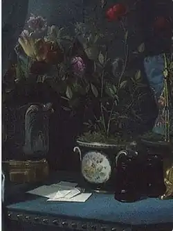 She wears a heavily folded, cold grey-blue satin dress painted with the same hue as her eyes. Her hair is parted and topped with a crimson ribbon at the back. The dresser before the mirror contains a variety of writing materials, pots and flowers, and a lavishly decorated oriental vase. The central motif of both the final painting and its predecessors is her raised left-hand index finger, coyly placed by her mouth, and her sinuous, unnaturally elongated right arm.[2]