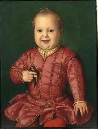 An extended title for this portrait is the Portrait of Giovanni de’ Medici as a Child holding a Goldfinch. It was painted sometime between 1544 and 1545, based on the child's age. Giovanni was born in the September 1543 and this portrait depicts him at the age of eighteen months.[1] He is wearing a pink doublet, which is painted with high detail. He holds a goldfinch (Carduelis carduelis) in his hand, which is a Christian symbol, because the goldfinch eats thistle seed and so is associated with Christ’s Crown of Thorns and the Passion. It appears in religious paintings to represent the knowledge of the future Crucifixion. Around his neck, he wears a gold chain with a coral and other charms. It was believed that coral could protect children from harm.
