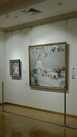 Portrait of Varya Adoratskaya is an oil painting on canvas. The canvas size is 135 × 145 cm (although the exhibition catalog from the Moscow gallery "Art-Divage" lists other dimensions: 138 × 147.2 cm).[11] At the bottom left are the artist's signature and the date of the painting: N. Fechin 1914.[11] The painting is part of the collection of the State Museum of Fine Arts of the Republic of Tatarstan in Kazan. The inventory number of the canvas in the collection is Zh-938.[12] Since 2005, Portrait of Varya Adoratskaya has been exhibited in the Nicolai Fechin Hall on the third floor of the permanent exhibition at the National Art Gallery Khazine.[3]